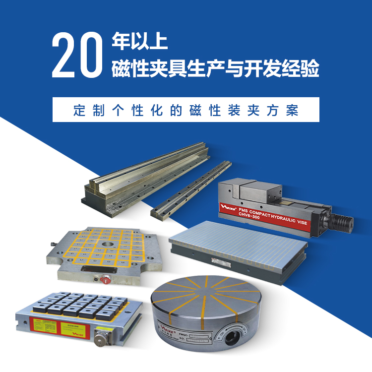 紹興市威克精密機械有限公司是一家專業從事磁性夾具生產與開發的企業,擁有20年以上的行業經驗。威克產品系列包括電磁吸盤、電控永磁吸盤、永磁吸盤、電永磁快速換模系統、真空吸盤、磁力吊重器、充退磁控制器、精密虎鉗、手轉工具萬力、磨床法蘭、沖子成型器、銑刀研磨機、自動攻絲機、倒角機、磁性座、機床附件等。我們的產品廣泛應用于銑床,平面磨床和CNC......